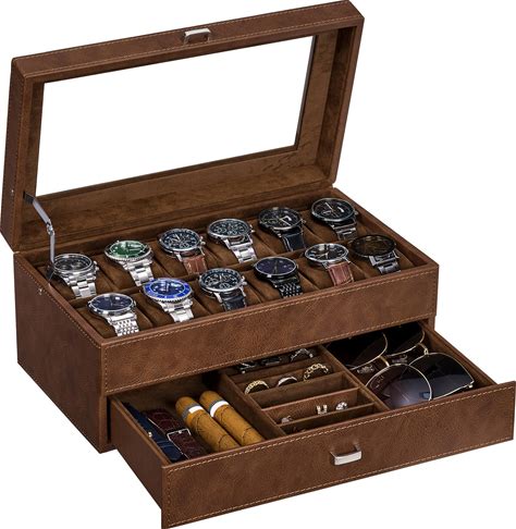 BEWISHOME Watch Box For Men, 12-Slot Watch Case, 2-Layer Watch Case With Drawer, Mens Jewelry Box With Large Glass Lid, Watch Display Case Watch