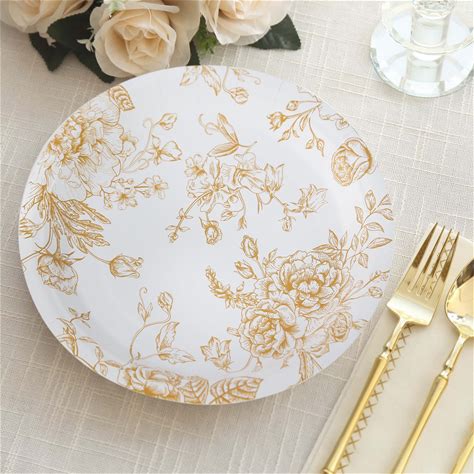 25-Pack Paper Round Dinner Plates 9" White With Gold French Toile Pattern | Disposable Floral Party For Chic Events - Weddings, Events By Efavormart Party Shop