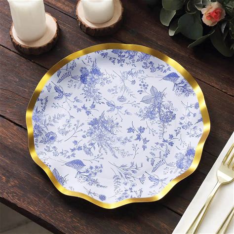 25-Pack Paper Round Dinner Plates 10" White Blue French Toile Floral Pattern With Gold Wavy Rim | 350Gsm Disposable Party - Weddings, Events By Efavormart Party Shop