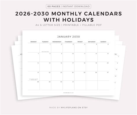 2026-2030 Monthly Calendars With Holidays, Printable Calendar Template, Landscape, Minimalist Calendar, Instant Download, A4/Letter