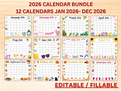 Editable 2026 Calendar Bundle- Printable January Calendar 2026- Monthly Calendars For The Whole Year- Cute Calendar- Fillable Calendars