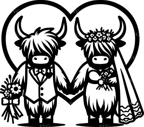 Wedding Highland Cow SVG 3 Cut File, Bride And Groom Cows In Heart Frame, Rustic Wedding Craft Design