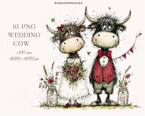Wedding Highland Cow, Bride And Groom Cows, Rustic Farm Wedding PNG, Whimsical Watercolor Illustration