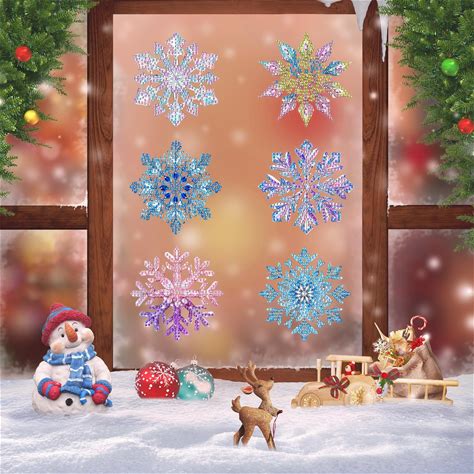 Ginfonr 6 PCS Christmas Window Clings, Snowflake Diamond Acrylic Window Static Ornaments, 5D Xams Double Sided DIY Reusable Christmas Indoor Decor